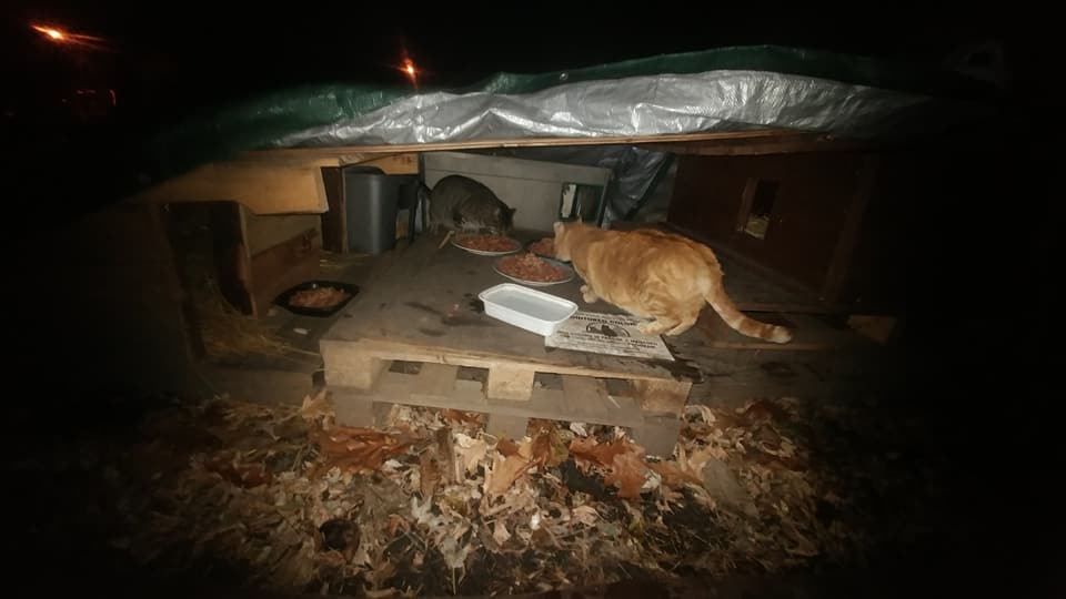 For those of you new to reading this blog, here is what I do on a daily basis, every day at 3:45 am., and there is no change in the time frame, and there is never a break. Cats, like humans, need to eat every day. I head out with a headlamp around my neck, SEVEN 2-gallon ziplock bags full of dry food, 6 large yogurt sized tubs of wet food + 8 cans in a spare bag for extra stops. At each stop, I have shelters for the cats so that they have protection from the storms we get, and space underneath boards and tarps to protect the food. At each stop there are an average of five cats waiting for me. They get bowls of dry and dollops of wet. They get warm water in the winter until it freezes. I spend an average of five minutes at each of the 19 or so locations around the public market. Each spot is either in a vacant lot, or a vacant house somewhere. Its always under the cover of darkness because if people saw me in the daylight, I am sure a lot of my spots would be trashed. Its also much safer at 4 am. than it is at 8 pm. Most people just don't care about cats in these neighborhoods.